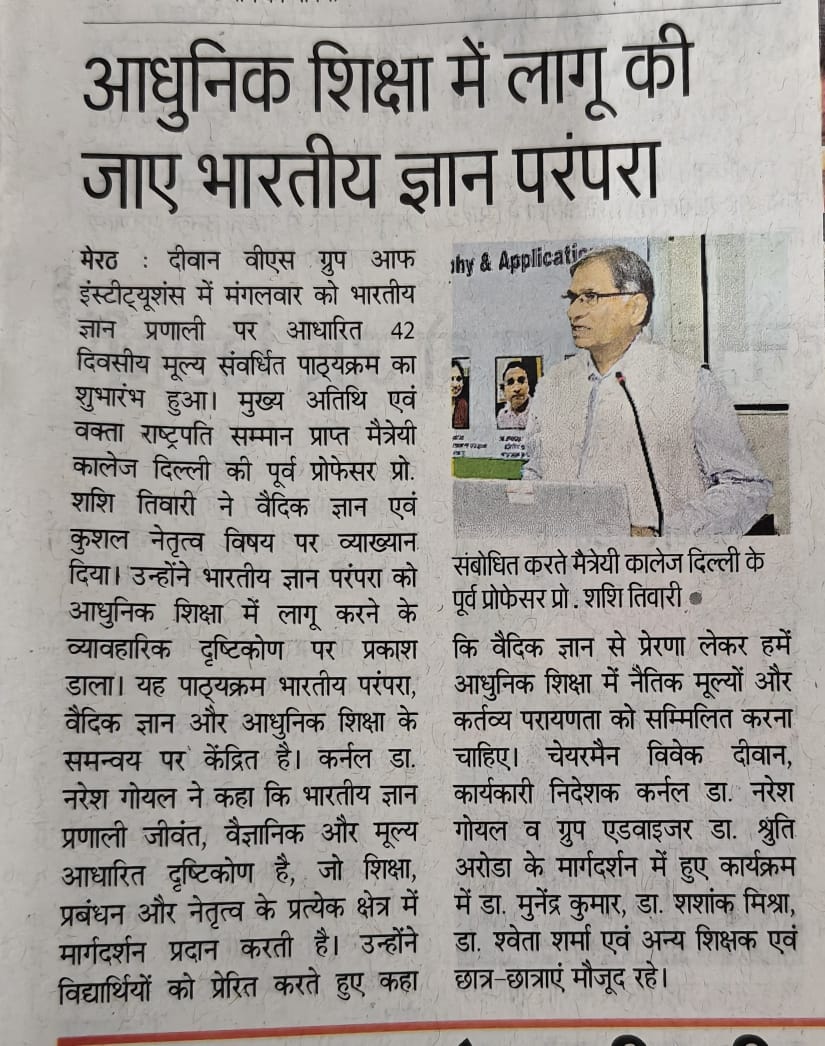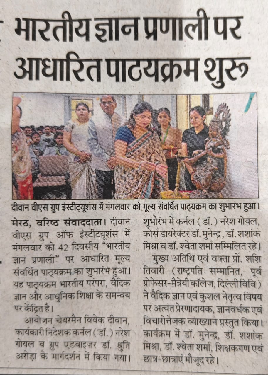 The 42-day Value Added Course on Indian Knowledge System (IKS) was inaugurated at Dewan VS Group of Institutions (DVSGI) on 4th November 2025, under the esteemed guidance of Mr. Vivek Dewan (Chairman), Col. (Dr.) Naresh Goyal (Executive Director), and Dr. Shruti Arora (Group Advisor).